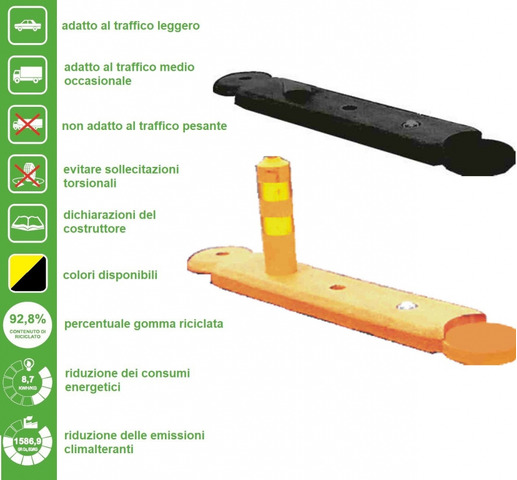 Il cordolo è realizzato in gomma riciclata. Il prodotto è di facile installazione, la giunzione tra gli elementi risulta continua, gli elementi imperniati dal tassello di fissaggio (tre in dotazione) possono essere facilmente angolati. Si possono installare facilmente marker edelineatori flessibili cilindrici rifrangenti (optional). UtilitàIl prodotto, avendo una sezione antiribaltamento, è adatto per la realizzazione di isole di traffico e la perimetrazione dei marciapiedi.MaterialiGomma riciclata.ColoriGli elementi in gomma sono di colore nero, possono essere rivestiti con uno strato di poliuretano elastomerico colore giallo.FissaggioTasselli 14x120 (3 inclusi).Caratteristiche tecnichemm1000x170x49h.Norme di riferimentoD.M.n.203 DEL 08/05/2003Codice della Strada (D.Lgs del 30 aprile 1992, n. 285 e successivi aggiornamenti);Decreto del Presidente della Repubblica n.610/96;Ministero delle Infrastrutture e dei Trasporti Note Ispettorato prot.3151/2.