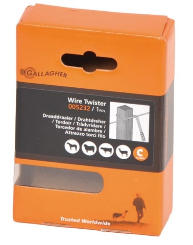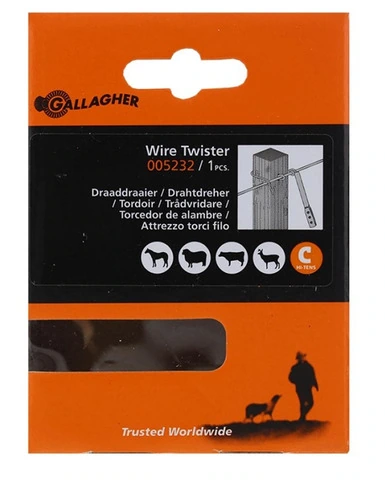CODICE ARTICOLO: ITALFROM_11466 Torci Filo GALLAGHER per Recinzioni ElettricheQuesto piccolo attrezzo è molto utile per torcere facilmente i fermagli metallici che fissano i fili della recinzione sui pali insultimber ed Ecopost. Altezza (mm): 110 Larghezza (mm): 30 Lunghezza (mm): 80 Perchè scegliere i materiali per recinzioni elettriche Gallagher?Gallagher è il marchio di qualità per le recinzioni elettrificate da più di 80 anni. Azienda leader nel campo delle recinzioni elettriche adatte sia per la protezione degli animali che per il loro respingimento. I materiali Gallagher sono di elevata qualità, molto resistenti e hanno una notevole durata nel tempo.I prodotti Gallagher sono venduti e apprezzati in tutto il mondo per innovazione, potenza e qualità in grado di offrire sicurezza e protezione a uomini e animali. Una recinzione elettrificata Gallagher è quanto di meglio si possa installare in termini di affidabilità, durevolezza e sicurezza. Rappresenta il top di mercato. La recinzione elettrica è una barriera fisica e psicologica molto efficace: gli animali, dopo essere entrati a contatto con la recinzione, la rispettano e la evitano. La recinzione elettrica può essere installata per il controllo di animali domestici ma anche per proteggere le colture e gli animali domestici da predatori e selvatici dannosi. Consente di realizzare facilmente recinzioni temporanee per migliorare lo sfruttamento dei pascoli. La recinzione elettrica si installa facilmente e, in genere, non richiede particolari attrezzi o capacità, ha un basso impatto ambientale e può essere installata senza permessi.GARANZIA: 2 ANNI
