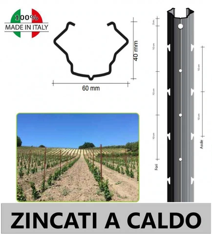 CODICE ARTICOLO: ITALFROM_4483 Conf.10 pz € 253.15+ iva - SPESS: 2,00 mm -PESO: Kg4,75- il Palo 'con asole interne' 60x40mm a 'V' viene usato per impianti di vigneti 'tipo spalliera' -Prodotto made in Italy - PER ALTEZZE PERSONALIZZATE RICHIEDI UN PREVENTIVO . Il palo, con sezione 60x40 mm. a profilo aperto, è adatto per impianti vigneto a spalliera La sua particolare sezione e le nervature assicurano robustezza e resistenza alle normali sollecitazioni denvanti dai processi di meccanizzazione. Il profilo aperto evita la formazione di condensa e ossidazione nella parte interna. Il trasporto e la posa in opera sono rese semplici e veloci. Le asole, poste a intervalll di 15 cm, hanno forma a \'N\' che impedisce la fuoriuscita casuale del filo.Il palo della serie 'V' è il risultato di un'attenta progettazione destinata a rispondere alle più elevate esigenze di robustezza e stabilità del filare. La sua originale sezione a 'V'' permette un'assoluta stabilità nel terreno, rispondendo in modo positivo a tutte le sollecitazioni derivanti dalla meccanizzazione e agli episodi temporaleschi , sempre più estremi, con precipitazioni e ventosità che mettono a dura prova i filari a spalliera. La sezione allargata, disponibile in due versioni di 60 mm e 70 mm, consente inoltre di evitare la 'chiusura' troppo accentuata della chioma. Questa caratteristica evita, nel processo di contenimento meccanico della chioma, il danneggiamento dei tralci. Le asole antisgancio a 'N', distanziate a intervalli di 15 cm, consentono la stabilità del filo anche su terreni con cambi di livello.Fornibile a richiesta in vari spessori e con varie finiture, Prezincato, Corten, Zincato a caldoIl Palo in Metallo ha ormai preso piede nella viticoltura moderna quale valido sostituto ai più tradizionali pali in Legno e pali in cemento. La facile manualità del Palo in Metallo permette anche negli impianti più impervi, la realizzazione di un Vigneto che rispecchia i più alti standard qualitativi.I sostegni metallici rappresentano una soluzione adeguata, perchè associano ad un limitato ingombro un'ottima resistenza.PALO ZINCATO A CALDO La zincatura è un trattamento finalizzato alla protezione delle parti in acciaio dalla corrosione e dalla ruggine.La zincatura a caldo si ottiene immergendo il prodotto gia stampato,profilato e opportunamente decapato e sgrassato in vasche contenenti zinco fuso ad una temperatura di circa 450° per un tempo di immersione che varia a seconda dello spessore che si deve ottenere.Questo trattamento produce un rivestimento protettivo di ossidi,carbonati e idrati di zinco che si lega metallurgicamente al substrato, isolando quindi l' acciaio.Inoltre in caso di scalfiture o abrasione , lo strato di zinco avendo potenziale minore , si ossida al posto dell' acciao.Per queste caratteristiche l' acciao zincato a caldo offre ottima resistenza agli urti e alle abrasioni , garantendo notevole durata nel tempo.La zincatura viene eseguita seguendo le specifiche dettate dalla norma europea UNI EN ISO 1461