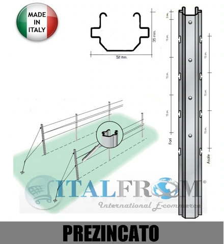 il Palo 'con asole interne'52x35mm viene usato per impianti di vigneti 'tipo spalliera' -Prodotto made in Italy - SPESS: 1,50mm - PESO: 2,84 Kg   PER ALTEZZE PERSONALIZZATE RICHIEDI UN PREVENTIVO .Il palo, con sezione 52x35 mm. a profilo aperto, è adatto per impianti  vigneto a spalliera La sua particolare  sezione e le nervature assicurano robustezza e resistenza alle normali sollecitazioni denvanti  dai processi  di meccanizzazione.  Il profilo  aperto evita la formazione  di condensa  e ossidazione nella parte interna. Il trasporto e la posa in opera sono rese semplici e veloci. Le asole, poste a intervalll di 15 cm, hanno forma a \'N\' che impedisce la fuoriuscita casuale del filo.Fornibile a  richiesta in vari spessori e con varie finiture, Prezincato, Corten, Zincato a caldoIl Palo in Metallo ha ormai preso piede nella viticoltura moderna quale valido sostituto ai più tradizionali pali in Legno e pali in cemento. La facile manualità del Palo in Metallo permette anche negli impianti più impervi, la realizzazione di un Vigneto che rispecchia i più alti standard qualitativi.I sostegni metallici rappresentano una soluzione adeguata, perchè associano ad un limitato ingombro un'ottima resistenza.PALO PREZINCATO Il palo prezincato si caratterizzano per una buona durata nel tempo e per la loro economicità nei confronti degli altri profilati.