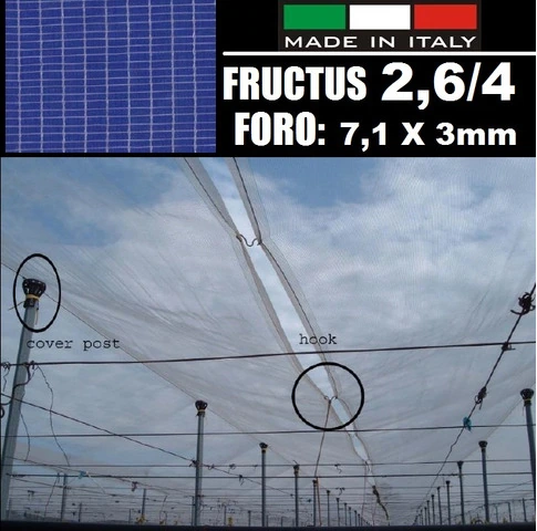 CODICE ARTICOLO: ITALFROM_4583 Antigrandine per vigneti e frutteti rotolo di rete in monofilo con intreccio a giro inglese, peso g. 53/m2, foro mm. 7,1x2,5, colore bianco trasparente ,  ombreggiamento del6%.Rete per la protezione della produzione e delle piante di uva da tavola, la misura delle maglie permette l’aereazione del vigneto e riduce l’incidenza delle malattie fungine . Inoltre ha un minor fattore di ombreggiamento delle rete a maglia più fitta. Dimensione del foro mm7,1x2,5; PROTEZIONE DALLA GRANDINE La tecnologia produttiva dell’uva da tavola deve garantire alti livelli qualitativi e una costanza produttiva che le permetta di soddisfare le esigenze della moderna distribuzione organizzata. A questo scopo il supporto dell’assicurazione antigrandine non è più sufficiente, infatti oltre grazie ai danni che subisce il vigneto, la perdita del raccolto impegna il produttore a reperirlo sul mercato oppure al pagamento di onerose penali. In questo contesto l’impianto antigrandine s’inserisce con successo garantendo sia la protezione della pianta che del prodotto.La scelta della tipologia di rete (più o meno fitta) dipende dalla varietà coltivata e dalla zona di produzione. Per esempio le varietà vigorose, con una abbondante produzione di viticci (prevalentemente cv apireni) vanno obbligatoriamente protette con reti a maglia fitta per evitare che i viticci si insinuino nelle maglie, complicando le fasi di chiusura nel periodo invernale. Per le cultivar meno vigorose si può scendere di magliatura, garantendo sempre un ottima protezione. La gamma FRUCTUS comprende le tre tipologie di rete indicate per proteggere i vigneti ad uva da tavola; in ordine di magliatura crescente:FRUCTUS 2,6/4FRUCTUS 4/4FRUCTUS 5/4Le reti si differenziano fra loro per la fittezza della tessitura.IMPORTANTI EFFETTI DELLE RETI Le reti anti-grandine fitte, se pur minimamente, influenzano il microclima del vigneto. Infatti, il calore che viene immagazzinato nel sistema (IR corto) durante il giorno viene rilasciato durante la notte e la rete tende a rallentarne la perdita; inoltre durante il giorno (IR lungo) le coperture con reti, tendono a far aumentare le temperature, in rapporto alla riduzione della velocità del vento. Questi effetti si traducono in una maggiore uniformità vegetativa ed un miglior sviluppo di germogli e grappoli. I benefici aumentano se si provvede a chiudere anche il perimetro del tendone; le reti che si utilizzano per tale scopo sono le seguenti:SCIROCCO MD WHITE (6/6) Frangivento medio frangivento trasparente. Dimensione del foro mm 1,39 x 1,72 BIORETE 40 MESH (16/10) Rete piana per la protezione dagli insetti utilizzata per il posizionamento lungo i perimetri del tendone. Dimensione del foro mm 0,74 x 1,17