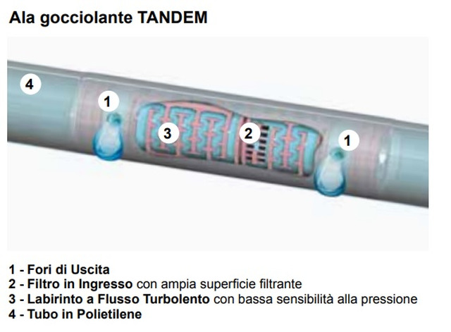CODICE ARTICOLO: ITALFROM_10175 Ala Gocciolante Classica Mod.Tandem con Gocciolatore Cilindrico Rotolo 100 metri Diam.16 mmTandem è l'ala gocciolante integrata normale con gocciolatore di minori dimensioni. Ciò comporta minime perdito di carico, consentendo di relazzare notevoli lunghezze d'ala. Il gocciolatore regola il flusso di erogazione, garantendo un'ottima uniformità irrigua. Questa tecnologia applicata in fase di progettazione e in produzione ha consentito di ottenere un gocciolatore con caratteristiche idrauliche eccellenti. Il gocciolatore provvisto di un filtro in ingresso riduce notevolmente il rischio di occlusione derivante dall’uso di acque “difficili” da filtrare.Il seguente prodotto offre ottime caratteristiche di resistenza agli stress termici e meccanici mantenendo inalterate le prestazioni.ALA GOCCIOLANTE CON GOCCIOLATORI DA 2 LITRI/H - DISTANZA TRA GOCCIOLATORI 30 CM DIAMETRO 16 MM ROTOLO 100 METRICaratteristiche e vantaggi- La doppia foratura del gocciolatore garantisce un aumento della superificie irrigata con conseguente riduzione della percolazione- Ala con quattro fori di emissione in posizione opposti che impediscono l'aspirazione dell'impurità, per una stesura semplificata- Il gocciolatore a flusso turbolento ( autopulente ) evita la formazione di sedimentazioni all'interno del labirinto- Il gocciolatore provvisto di un filtro in ingresso riduce notevolemnte il rischio di occlusione derivante dall'uso di acque 'difficili'- I fori d'uscita del gocciolatore permettono una veloce e facile installazione senza la necessità di verificare la posizione del punto di emissione, assicuro lo svuotamento delle tubazioni alla fine del ciclo irriguoIl seguente prodotto consente l'installazione di un impianto di facile utilizzo e automatizzabile, nonchè una maggiore efficienza dell'acqua, con somministrazione diretta sul terreno e minori dispersioni. E' un prodotto estremamente innovativo, una soluzione semplice ed estremamente economica per l'irrigazione a goccia in svariate applicazioni.