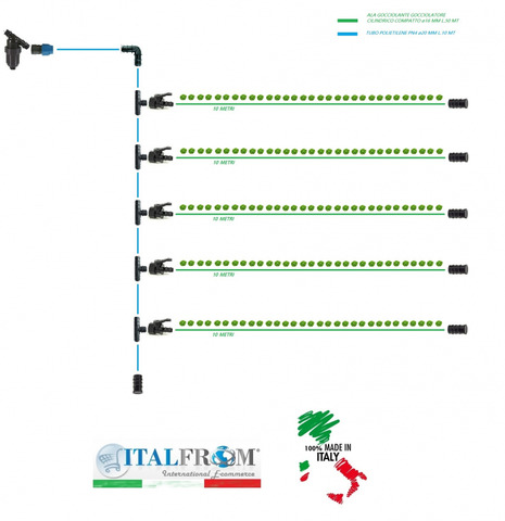 CODICE ARTICOLO: ITALFROM_10676 Kit Irrigazione a Goccia Italfrom fino a 50 MqIl kit completo Italfrom è studiato per l'irrigazione a goccia su una superficie fino a 50 metri quadrati, e consente di creare un impianto di irrigazione in pochi e semplici passi; rende accessibile alla portata di tutti la più alta tecnologia utilizzata in questo campo. Il kit è facile da montare e non necessita di attrezzi professionali. Prodotti di qualità professionale uniti ad una elevata sempicità di installazione. All'interno del kit sono presenti tutti i tubi, i raccordi e le valvole necessarie alla creazione di un impianto di irrigazione a goccia di stampo professionale. Il seguente prodotto è un kit per l'i...