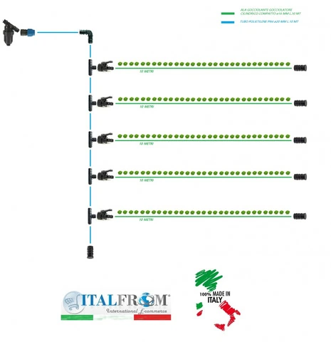 CODICE ARTICOLO: ITALFROM_10676 Kit Irrigazione a Goccia Italfrom fino a 50 MqIl kit completo Italfrom è studiato per l'irrigazione a goccia su una superficie fino a 50 metri quadrati, e consente di creare un impianto di irrigazione in pochi e semplici passi; rende accessibile alla portata di tutti la più alta tecnologia utilizzata in questo campo. Il kit è facile da montare e non necessita di attrezzi professionali. Prodotti di qualità professionale uniti ad una elevata sempicità di installazione. All'interno del kit sono presenti tutti i tubi, i raccordi e le valvole necessarie alla creazione di un impianto di irrigazione a goccia di stampo professionale. Il seguente prodotto è un kit per l'irrigazione 'Pronto all'uso' che permette una distribuzione uniforme dell'acqua e dei nutrienti vicino alle radici delle painte. Inoltre rende disponibile la più alta tecnologia disponibile nell'irrigazione a goccia ad un costo accessibile per tutti.KIT IMPIANTO IRRIGAZIONE FAI DA TE PER 50 MQ DI ORTOCaratteristiche e vantaggi Kit completo (10 metri di tubo polietilene bassa densità e 50 metri ala gocciolante) Funzionamento con basse pressioni d'acqua Basso consumo d'acqua Ideale per il fai da te Fino a 50 metri quadrati Componenti del kit 1 PZ - TUBO POLIETILENE BASSA DENSITA' PEBD PN4 DIAMETRO 20 MM LUNGHEZZA 10 MT 1 PZ - ALA GOCCIOLANTE CON GOCCIOLATORE CILINDRICO ( 2 LITRI/H) COMPATTO ROTOLO 50 METRI ø16 MM. DISTANZA TRA GOCCIOLATORI 30 CM 5 PZ - RACCORDO NYLON-TEE A 90° CON FILETTO MASCHIO MM.20 X 3/4' PN16 5 PZ - MINI VALVOLA A SFERA CON FILETTO FEMMINA / PORTAGOMMA MM.16 X 3/4' 1 PZ - RACCORDO NYLON FEMMINA PN16 MM.20 X 3/4' 1 PZ - RACCORDO NYLON GOMITO A 90° MM.20X201 PZ - FILTRO PER IMPIANTO INTERRATO POLIESTERE GR.3/4' (YCV) 1 PZ - RACCORDO TERMINALE ø20 MM. 5 PZ - RACCORDO TERMINALE ø16 MM.