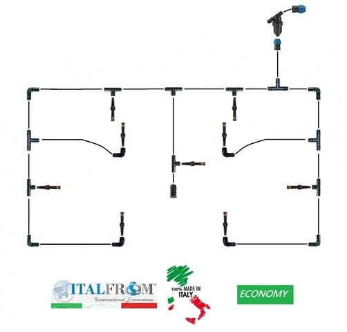 CODICE ARTICOLO: ITALFROM_10672 Kit Irrigazione Italfrom Economy per Microirrigazione Interrata fino a 100 MqIl kit completo Italfrom Economy è studiato per la microirrigazione interrata su una superficie fino a 100 metri quadrati, e consente di creare un impianto di irrigazione in pochi e semplici passi; rende accessibile alla portata di tutti la più alta tecnologia utilizzata nella microirrigazione. Il kit è facile da montare e non necessita di attrezzi professionali. Prodotti di qualità professionale uniti ad una elevata sempicità di installazione. All'interno del kit sono presenti tutti i tubi, i raccordi e le valvole necessarie alla creazione di un impianto di microirrigazione interrata di stampo professionale. Il seguente prodotto è un kit per l'irrigazione 'Pronto all'uso' che permette una distribuzione uniforme dell'acqua e dei nutrienti vicino alle radici delle painte. Inoltre rende disponibile la più alta tecnologia disponibile nella microirrigazione ad un costo accessibile per tutti.Caratteristiche e vantaggi Kit completo (50 metri di tubo collettore) Funzionamento con basse pressioni d'acqua Microirrigatori con gittata regolabile Basso consumo d'acqua Ideale per il fai da te Fino a 100 metri quadrati Con irrigatori regolabiliComponenti del kit 1 PZ - TUBO POLIETILENE BASSA DENSITA' PEBD PN4 DIAMETRO 20 MM LUNGHEZZA 50 MT 5 PZ - RACCORDO NYLON-TEE CON FILETTO MASCHIO GIUNZIONE MM.20 X 1/2' PN16 4 PZ - RACCORDO NYLON-TEE 90° GIUNZIONE MM.20 X 20 X 20 PN16 2 PZ - RACCORDO NYLON FEMMINA PN16 MM.20 X 3/4' 9 PZ - IRRIGATORE POP-UP CON TESTINA UNIVERSALE REGOLABILE ALZATA 10 CM 4 PZ - RACCORDO NYLON A GOMITO 90° CON FILETTO MASCHIO MM.20 X 1/2' PN16 1 PZ - FILTRO PER IMPIANTO INTERRATO POLIESTERE GR.3/4' (YCV) 4 PZ - RACCORDO NYLON GOMITO 90° MM.20 X 20 PN16 1 PZ - RACCORDO TERMINALE MM.20