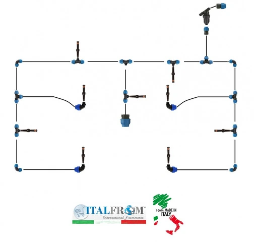 CODICE ARTICOLO: ITALFROM_10665 Kit Irrigazione Italfrom per Microirrigazione Interrata fino a 100 MqIl kit completo Italfrom è studiato per la microirrigazione interrata su una superficie fino a 100 metri quadrati, e consente di creare un impianto di irrigazione in pochi e semplici passi; rende accessibile alla portata di tutti la più alta tecnologia utilizzata nella microirrigazione. Il kit è facile da montare e non necessita di attrezzi professionali. Prodotti di qualità professionale uniti ad una elevata sempicità di installazione. All'interno del kit sono presenti tutti i tubi, i raccordi e le valvole necessarie alla creazione di un impianto di microirrigazione interrata di stampo professionale. Il seguente prodotto è un kit per l'irrigazione 'Pronto all'uso' che permette una distribuzione uniforme dell'acqua e dei nutrienti vicino alle radici delle painte. Inoltre rende disponibile la più alta tecnologia disponibile nella microirrigazione ad un costo accessibile per tutti.Caratteristiche e vantaggi Kit completo (50 metri di tubo collettore) Funzionamento con basse pressioni d'acqua Microirrigatori con gittata regolabile Basso consumo d'acqua Ideale per il fai da te Fino a 100 metri quadrati Con irrigatori regolabiliComponenti del kit 1 PZ - TUBO POLIETILENE BASSA DENSITA' PEBD PN4 DIAMETRO 20 MM LUNGHEZZA 50 MT 1 PZ - TAPPO NYLON TERMINALE MM.20 PN16 5 PZ - RACCORDO NYLON-TEE MASCHIO GIUNZIONE MM.20 X 1/2' PN16 4 PZ - RACCORDO NYLON-TEE 90° GIUNZIONE MM.20 X 20 X 20 PN16 2 PZ - RACCORDO NYLON FEMMINA PN16 MM.20 X 3/4' 9 PZ - IRRIGATORE POP-UP CON TESTINA UNIVERSALE REGOLABILE ALZATA 10 CM 4 PZ - RACCORDO NYLON A GOMITO 90° MM.20 X 20 PN16 1 PZ - FILTRO PER IMPIANTO INTERRATO POLIESTERE GR.3/4' (YCV)4 PZ - RACCORDO NYLON GOMITO 90° MM.20 X 1/2' PN16