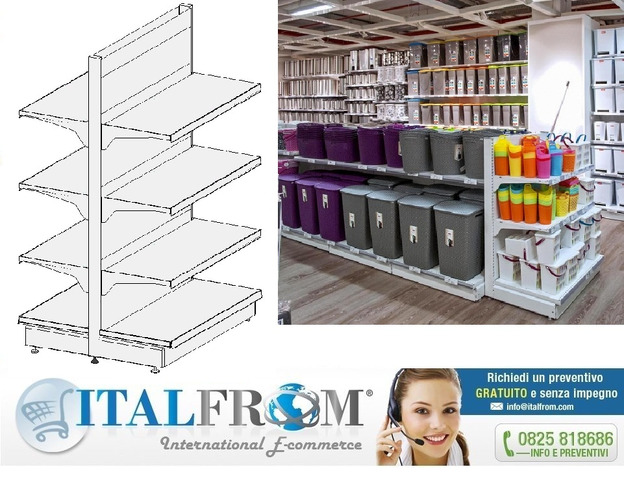 CODICE ARTICOLO: ITALFROM_8769 DESCRIZIONE MATERIALE IN VENDITAscaffalatura da esposizione componibile verniciata  MODULO INIZIALE scaffalatura a gondola Lunghezza 133 cm , H 166 cm , prof. 40 +40 cm , con base + 3 ripiani ( regolabili in base alle vostre esigenze ) portaprezzo in Pvc in dotazione Dettaglio fornitura :- n° 2 montanti H cm. 166 con asolatura bifronte- n° 2 piano di base di cm. 133x40 - n° 6 piani con mensole regolabili in altezza di cm. 133x40 - n° 2 zoccolo di rifinitura frontale antipolvere - n° 2 coppia di piedi terminali (sinistro e destro) - n° 2 schiena liscia h 166 cm- portaprezzi per tutti i ripiani con colore a scelta  N.B. PER PROSEGUIRE LA SCAFFALATURA FARE RIFER...