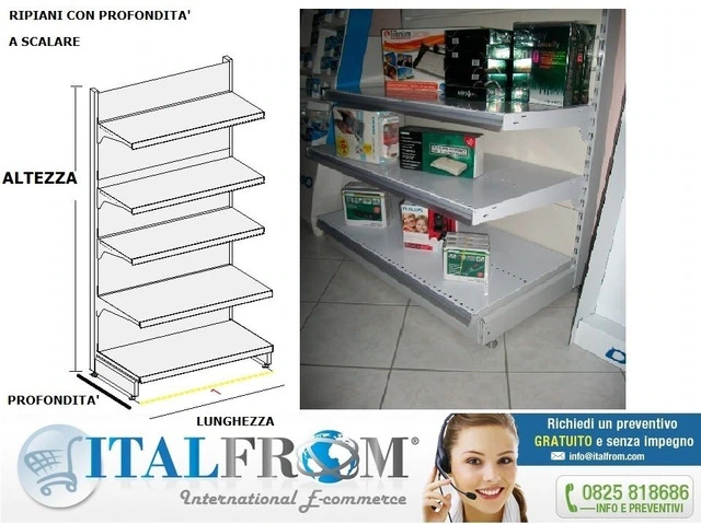 CODICE ARTICOLO: ITALFROM_8765 DESCRIZIONE MATERIALE IN VENDITAscaffalatura da esposizione componibile verniciata MODULO INIZIALE Lunghezza 133 cm , H 250 cm , prof.base 50 cm + 1 ripiano da 50 cm + 3 ripiani da 40 cm ( regolabili in base alle vostre esigenze ) portaprezzo in Pvc in dotazione Dettaglio fornitura :- n° 2 montanti H cm. 200 con asolatura- n° 1 piano di base di cm. 101x50- n° 1 piano con mensole regolabili in altezza di cm. 101x50- n° 3 piani con mensole regolabili in altezza di cm. 101x40 - n° 1 zoccolo di rifinitura frontale antipolvere - n° 1 coppia di piedi terminali (sinistro e destro) - n° 1 schiena schiena liscia h 250 cm- portaprezzi per tutti i ripiani con colore a scelta N.B. PER PROSEGUIRE LA SCAFFALATURA FARE RIFERIMENTO AI ''MODULI CONTINUATIVI'' NELLA STESSA CATEGORIA VANTAGGI DEL PRODOTTO - SICUREZZA MADE IN ITALY - MERCE CERTIFICATA - SEMPLICITA' DI MONTAGGIO ( COMPLETAMENTE AD INCASTRO ) - COLORE SCAFFALE : BIANCO- COLORE PORTAPREZZO A SCELTA : TRASPARENTE,ROSSO,VERDE,BLU,GIALLO- ESTREMA VERSATILITA' - SI ADDICE A QUALSISASI SPAZIO ESPOSITIVO - POSSIBILITA' DI AMPLIARE A PIACERE LA STRUTTURADESCRIZIONE PRODOTTO CERTIFICATO MADE IN ITALY Scaffalatura testata e sicura adatta ad arredare dal piccolo negozio al grade cento di distribuzione Versatilità ed eleganza degli accessori, finiture di qualità, concetti di design di interni innovativi, per creare un ambiente spettacolare che mettere in evidenza ogni articolo; materiali di qualità certificata, strutture resistenti nelle aree heavy duty e di stoccaggio materiali ingombranti; una vasta scelta di ripiani e fondali concepiti per le più diverse esigenze espositive: nessun dettaglio è lasciato al caso, per garantire sempre la massima affidabilità delle attrezzature e l'utilizzo migliore di qualunque area di vendita. Siamo a Vostra disposizione per preventivi personalizzati anche in 3D :