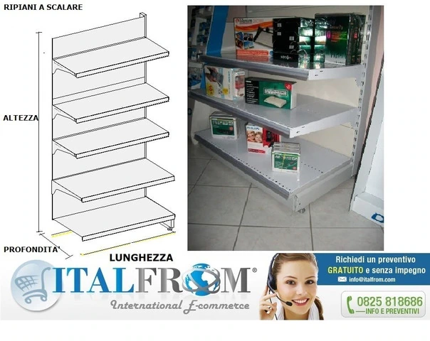 CODICE ARTICOLO: ITALFROM_8754 DESCRIZIONE MATERIALE IN VENDITAscaffalatura da esposizione componibile verniciata  MODULO CONTINUATIVO Lunghezza 133 cm , H 200 cm , prof. 40 cm , con base + 4 ripiani ( regolabili in base alle vostre esigenze ) portaprezzo in Pvc in dotazione Dettaglio fornitura :- n° 1 montante H cm. 200 con asolatura - n° 1 piano di base di cm. 133x40 - n° 4 piani con mensole regolabili in altezza di cm. 133x40 - n° 1 zoccolo di rifinitura frontale antipolvere - n° 1 coppia di piedi terminali (sinistro e destro) - n° 1 schiena schiena liscia h 200 cm- portaprezzi per tutti i ripiani con colore a scelta  VANTAGGI DEL PRODOTTO - SICUREZZA MADE IN ITALY - MERCE CERTIFICATA - SEMPLICITA' DI MONTAGGIO ( COMPLETAMENTE AD INCASTRO ) - COLORE SCAFFALE : BIANCO- COLORE PORTAPREZZO A SCELTA : TRASPARENTE,ROSSO,VERDE,BLU,GIALLO- ESTREMA VERSATILITA' - SI ADDICE A QUALSISASI SPAZIO ESPOSITIVO - POSSIBILITA' DI AMPLIARE A PIACERE LA STRUTTURADESCRIZIONE PRODOTTO CERTIFICATO MADE IN ITALY Scaffalatura testata e sicura adatta ad arredare dal piccolo negozio al grade cento di distribuzione Versatilità ed eleganza egli accessori, finiture di qualità, concetti di design di interni innovativi, per creare un ambiente spettacolare che mettere in evidenza ogni articolo; materiali di qualità certificata, strutture resistenti nelle aree heavy duty e di stoccaggio materiali ingombranti; una vasta scelta di ripiani e fondali concepiti per le più diverse esigenze espositive: nessun dettaglio è lasciato al caso, per garantire sempre la massima affidabilità delle attrezzature e l'utilizzo migliore di qualunque area di vendita. Siamo a Vostra disposizione per preventivi personalizzati anche in 3D :