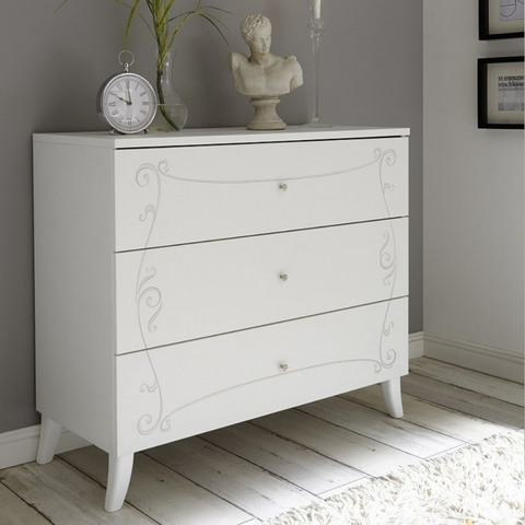 Comò Ararat Ararat com�, 3 cassetti con guide metalliche. Colore bianco opaco avatar con serigrafie glitterate argento. Misure in cm.: 104 x 45 x 92 H TEMPI DI CONSEGNA: 30/40 GIORNI