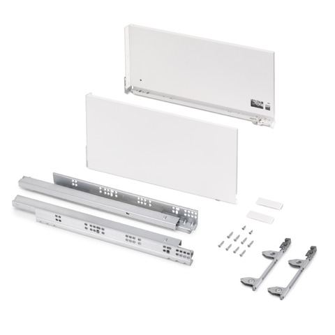 Kit per cassetti Vertex con regolazione 3D con tutti gli elementi necessari per il montaggio. È la soluzione ottimale per i mobili della vostra cucina, dal design elegante, che richiede un'elevata capacità di carico e un grande volume interno. Il frontale dei cassetti può essere regolato di ±2 mm in verticale, ±1 mm in orizzontale e con un'inclinazione di -1,5/+4mm.Ogni kit è composto da tutti gli elementi necessari per il montaggio di un cassetto alto 242 mm,  progettati per uno spessore del pannello di 16 mm. Comprende: due sponde laterali, un set di guide a chiusura morbida, un set di coperchi e i fissaggi per il frontale del cassetto. Le guide sono ad estrazione totale sincronizzata con chiusura ammo...