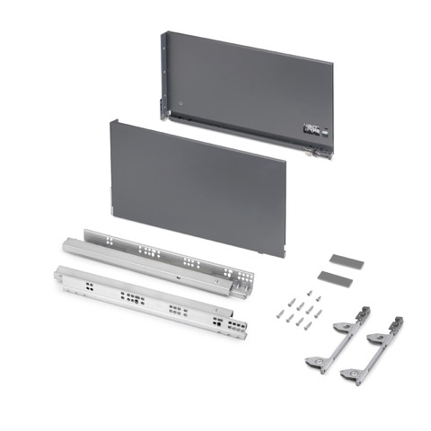 Kit per cassetti Vertex con regolazione 3D con tutti gli elementi necessari per il montaggio. È la soluzione ottimale per i mobili della vostra cucina, dal design elegante, che richiede un'elevata capacità di carico e un grande volume interno. Il frontale dei cassetti può essere regolato di ±2 mm in verticale, ±1 mm in orizzontale e con un'inclinazione di -1,5/+4mm.Ogni kit è composto da tutti gli elementi necessari per il montaggio di un cassetto alto 242 mm,  progettati per uno spessore del pannello di 16 mm. Comprende: due sponde laterali, un set di guide a chiusura morbida, un set di coperchi e i fissaggi per il frontale del cassetto. Le guide sono ad estrazione totale sincronizzata con chiusura ammo...