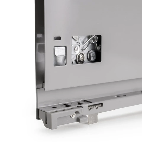 Le sponde laterale in metallo sono realizzate in acciaio con finitura verniciato grigio antracite, ha una regolazione frontale 3D: verticale tramite eccentrici di ±2 mm, orizzontale ±1 mm, inclinazione -1,5/+4 mm. Le guide sono di estrazione totale con chiusura ammortizzata e hanno una capacità di carico massima di 40 Kg per il cassetto.