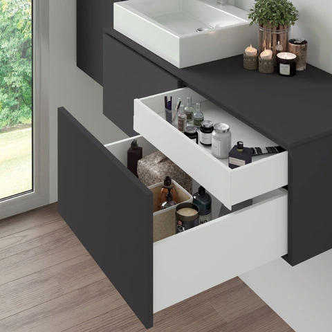 Le sponde laterale in metallo sono realizzate in acciaio con finitura verniciato grigio antracite, ha una regolazione frontale 3D: verticale tramite eccentrici di ±2 mm, orizzontale ±1 mm, inclinazione -1,5/+4 mm. Le guide sono di estrazione totale con chiusura ammortizzata e hanno una capacità di carico massima di 40 Kg per il cassetto.