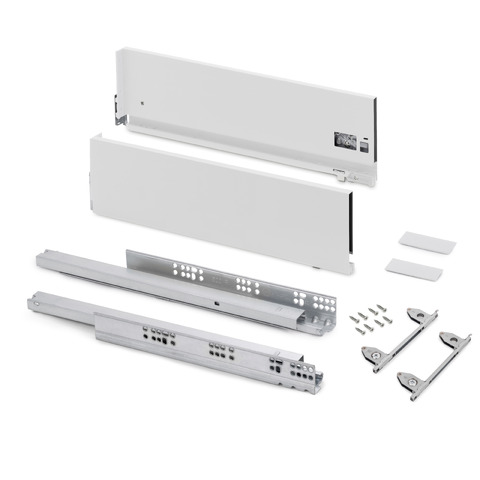 Kit per cassetto cucina e bagno Vertex con tutti gli elementi necessari per il suo assemblaggio. È la soluzione ottimale per i mobili della tua cucina, bagno o armadio con un design elegante. Ogni kit è composto da tutti gli elementi necessari per il montaggio di un cassetto esterno di 178mm di altezza, progettati per uno spessore del pannello di 16mm, sia per il fondo che per il retro del cassetto. Include: due sponde laterale, un set di guide con chiusura soft, un set di coperchi di rivestimento e i fissaggi per la parte anteriore del cassetto.Le sponde laterale in metallo sono realizzate in acciaio con finitura verniciato grigio antracite, ha una regolazione frontale 3D: verticale tramite eccentrici d...