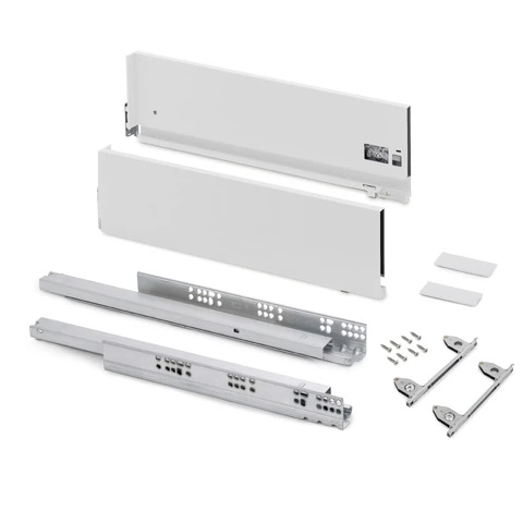 Kit per cassetto cucina e bagno Vertex con tutti gli elementi necessari per il suo assemblaggio. È la soluzione ottimale per i mobili della tua cucina, bagno o armadio con un design elegante. Ogni kit è composto da tutti gli elementi necessari per il montaggio di un cassetto esterno di 178mm di altezza, progettati per uno spessore del pannello di 16mm, sia per il fondo che per il retro del cassetto. Include: due sponde laterale, un set di guide con chiusura soft, un set di coperchi di rivestimento e i fissaggi per la parte anteriore del cassetto.