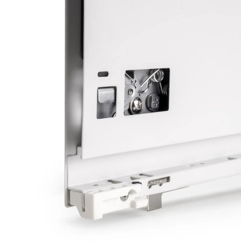 Le sponde laterale in metallo sono realizzate in acciaio con finitura verniciato grigio antracite, ha una regolazione frontale 3D: verticale tramite eccentrici di ±2 mm, orizzontale ±1 mm, inclinazione -1,5/+4 mm. Le guide sono di estrazione totale con chiusura ammortizzata e hanno una capacità di carico massima di 40 Kg per il cassetto.