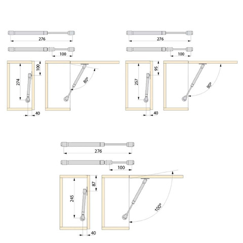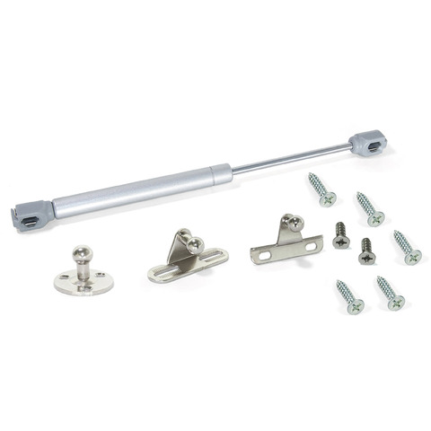Pistoni per mobili pensili che permettono l'apertura delle ante in legno o con struttura in alluminio. Regolano il sollevamento ammortizzato dell'anta del pensile nei mobili di casa. Sono imballati individualmente in buste con istruzioni di montaggio. Ogni busta contiene un pistone, un fermo per il fianco, un fermo per anta in legno, un fermo per anta in alluminio e viti necessarie.