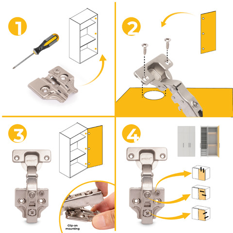 Cerniere per ante progettate per l'utilizzo nei mobili della casa e dell'ufficio con alta qualità e al miglior prezzo. Con pistone ammortizzatore che regola la chiusura soft dell'anta. Sono disponibili in collo dritto con apertura dell'anta a 105º. Per la sua istallazione è necessario un foro diametro 35 mm per lo scodellino. E il fissaggio al pannello avviene mediante le viti incluse. Allo stesso tempo è molto facile l'istallazione grazie al sistema automatico di montaggio a clip della cerniera alla basetta. Inoltre entrambi dispongono di vite eccentrica per una regolazione rapida e comoda. Il fissaggio della basetta avviene con vite Euro che necessita di un foro diamentro 5 x 12 mm nella spalla de...