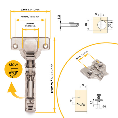 Cerniere per ante progettate per l'utilizzo nei mobili della casa e dell'ufficio con alta qualità e al miglior prezzo. Con pistone ammortizzatore che regola la chiusura soft dell'anta. Sono disponibili in collo dritto con apertura dell'anta a 105º. Per la sua istallazione è necessario un foro diametro 35 mm per lo scodellino. E il fissaggio al pannello avviene mediante le viti incluse. Allo stesso tempo è molto facile l'istallazione grazie al sistema automatico di montaggio a clip della cerniera alla basetta. Inoltre entrambi dispongono di vite eccentrica per una regolazione rapida e comoda. Il fissaggio della basetta avviene con vite Euro che necessita di un foro diamentro 5 x 12 mm nella spalla de...