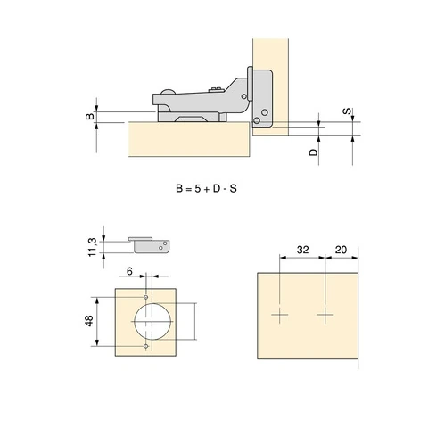 Per la sua istallazione è necessario un foro diametro 35 mm per lo scodellino. E il fissaggio al pannello avviene mediante le viti incluse. Allo stesso tempo è molto facile l'istallazione grazie al sistema automatico di montaggio a clip della cerniera alla basetta. Inoltre entrambi dispongono di vite eccentrica per una regolazione rapida e comoda.