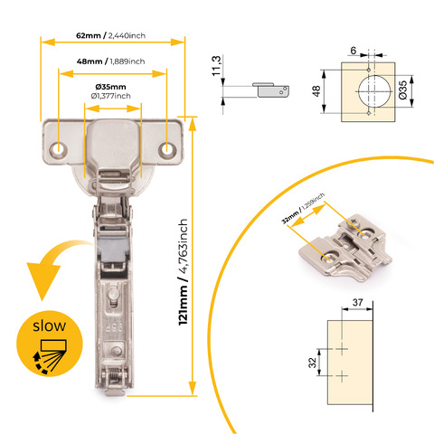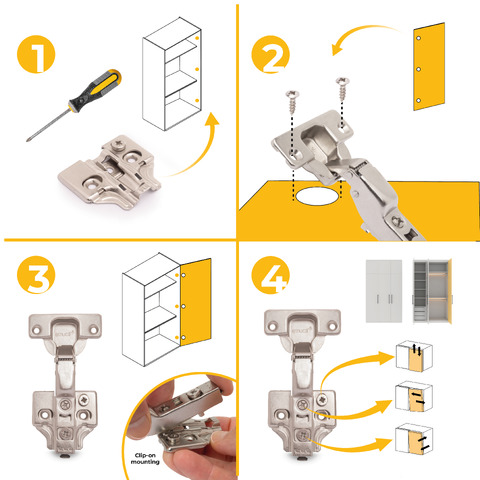 Cerniere per ante progettate per l'utilizzo nei mobili della casa e dell'ufficio con alta qualità e al miglior prezzo. Con pistone ammortizzatore che regola la chiusura soft dell'anta.Con apertura dell'anta a 105º. Per la sua istallazione è necessario un foro diametro 35 mm per lo scodellino. E il fissaggio al pannello avviene mediante le viti incluse.Allo stesso tempo è molto facile l'istallazione grazie al sistema automatico di montaggio a clip della cerniera alla basetta. Inoltre entrambi dispongono di vite eccentrica per una regolazione rapida e comoda.