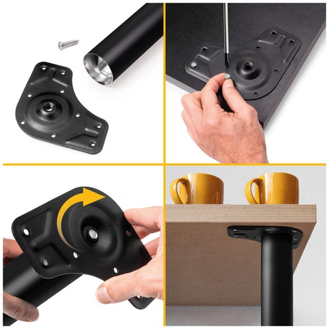 Gambe regolabili di diametro 60 mm sono ideali per ogni tipo di mobile della casa e dell'ufficio. Sono prodotti in acciaio e regolabili in altezza. Il montaggio è facile e si realizza avvitando una piastra al pannello del tavolo mediante viti (incluse) e poi avvitando la gamba alla piastra. In questo modo il montaggio e lo smontaggio della gamba al tavolo può avvenire più volte.
