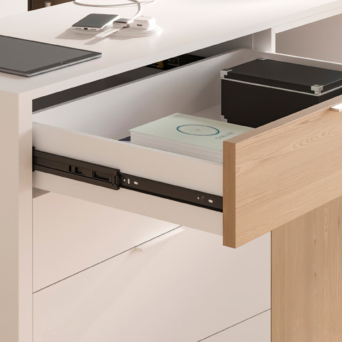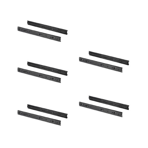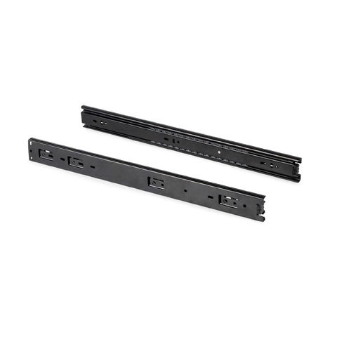 Guide con sfere con estrazione totale in acciaio zincato. Guida in altezza 45 mm. Si fissa al lato del mobile mediante viti (non incluse) e dispongono di un grilletto per lo smontaggio. Carico massimo fino a 30 kg.