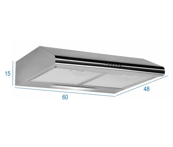 Cappa in Acciaio Inox 60 x 48 x h15 cm Caratteristiche:Cappa in acciaio inox con filtro carbone e alluminioLampada alogena e Motore 95 Watt 2 ante1 ripianoManiglia in plastica Made in Italy ColoreBianco FrassinatoDimensioni disponibili - 60x48x15h cm