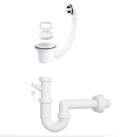 Kit Sifone E Piletta Per Scarico Per Vaschetta Lavapanni SingolaKit completo di sifone e piletta in polipropileneTroppopieno ?essibile tondo ø30Mostrina del troppopieno tonda biancaGattinara e tappo maniglia bianchiSifone a U, una via, con attacco lavatrice