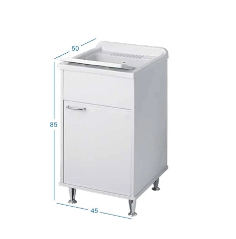 Mobile Lavanderia Con Vaschetta Adatto Per Esterni Disponibile in Diverse Misure Colore BiancoMobile Lavanderia in PVC resistente all’acquaSportelli pieni con chiusura a battente calamitataManiglie e piedini cromatiVasca in polipropilene resistente agli acidiAsse di lavaggio in polipropileneSifone autopulente completo di piletta e troppopienoPiedini regolabili in altezza 15 mmAdatta per esterni o luoghi umidiVasca forabile per installazione rubinetto (rubinetto non incluso)Scarico sifone a 35÷45 cm da terra Campo di applicazioneInstallazione adatta per esternoDimensioni Disponibili- 45 x 50 x H85 cm- 50 x 50 x H85 cmColori DisponibiliBianco
