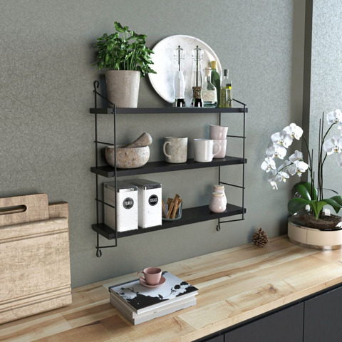 Mensola Neelix con 3 ripiani neri 60x15x62 nero MT191105Mensola con 3 ripiani neri 60x15x62 Neelix nero Mensola con tre ripiani con fissaggio a parete. Dettagli semplici ma eleganti, garantiranno la giusta sistemazione dei tuoi libri, vasi, piante e tutti gli oggetti che desideri. La puoi montare in cucina, in bagno, in soggiorno, la Neelix si integrer� facilmente ad ogni ambiente. Caratteristiche: Materiale acciaio e truciolare ricoperto in melaminico Peso massimo supportato 8 kg. Peso 3,3 kg. Dimensioni 60x15x62h cm. Prodotto fornito smontato. TEMPI DI CONSEGNA: 7/10 GIORNI