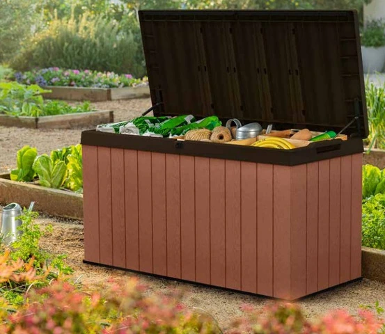 PORTATTREZZI DARW IN RESINA 142,9x65,5x78,2H cmLe casette porta attrezzi sono adatti da lasciare all’aperto, da utilizzare per custodire al riparo dalle intemperie strumenti, materiali e prodotti per il giardinaggio mantenendo in perfetto ordine il giardino.Realizzati in resina con finitura effetto legno. Struttura interna in geometria alveolare per una resistenza prolungata nel tempo.BAULE FORMATO DA PANNELLI IN EVOTECH, PISTONI LATERALI PER APERTURA FACILITATA, LUCCHETTABILE - CM. 142,9x65,5x78,2h - MARRONE EFFETTO LEGNO NATURALEDimensioni imballo 145 cm x 67 cm x 19 cm