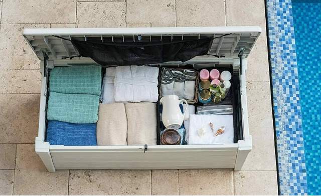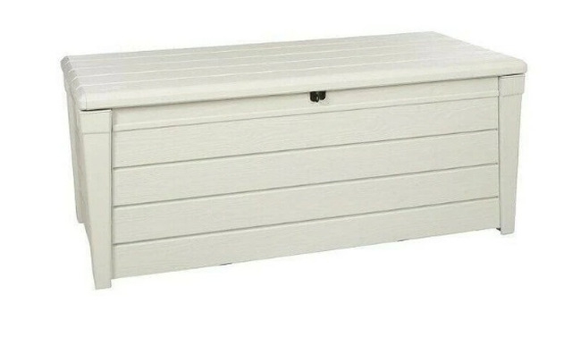 CODICE ARTICOLO: ITALFROM_11302 PORTATTREZZI ROCK BIANCO IN RESINA 155x72,4x64,4H cmLe casette porta attrezzi sono adatti da lasciare all’aperto, da utilizzare per custodire al riparo dalle intemperie strumenti, materiali e prodotti per il giardinaggio mantenendo in perfetto ordine il giardino.Realizzati in resina con finitura effetto legno. Struttura interna in geometria alveolare per una resistenza prolungata nel tempo.BAULE EXTRA LARGE IN RESINA CON FINITURA EFFETTO LEGNO, COPERCHIO CON PORTATA 300KG, PISTONI LATERALI PER APERTURA FACILITATA, LUCCHETTABILE - CM. 155x72,4x64,4h - 570 LT - BIANCODimensioni imballo 161,50 cm x 76,50 cm x 18,50 cm