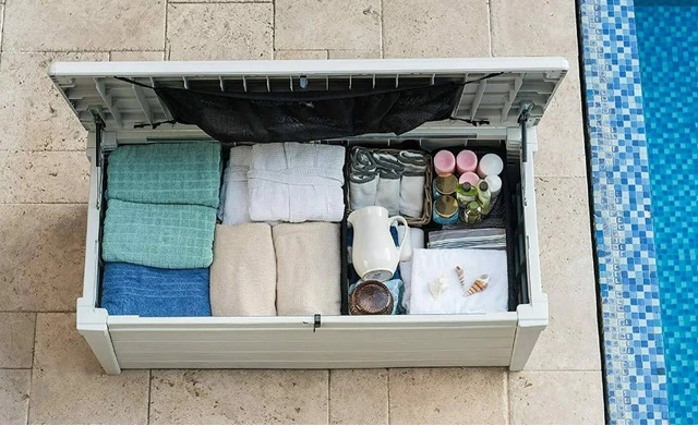 CODICE ARTICOLO: ITALFROM_11302 PORTATTREZZI ROCK BIANCO IN RESINA 155x72,4x64,4H cmLe casette porta attrezzi sono adatti da lasciare all’aperto, da utilizzare per custodire al riparo dalle intemperie strumenti, materiali e prodotti per il giardinaggio mantenendo in perfetto ordine il giardino.Realizzati in resina con finitura effetto legno. Struttura interna in geometria alveolare per una resistenza prolungata nel tempo.BAULE EXTRA LARGE IN RESINA CON FINITURA EFFETTO LEGNO, COPERCHIO CON PORTATA 300KG, PISTONI LATERALI PER APERTURA FACILITATA, LUCCHETTABILE - CM. 155x72,4x64,4h - 570 LT - BIANCODimensioni imballo 161,50 cm x 76,50 cm x 18,50 cm