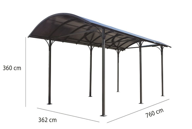 CARPORT / TETTOIA PER FURGONI E CAMPER IN ALLUMINIO E POLICARBONATO - cm 360X760XH 360 Ideale per proteggere dal sole, dalla pioggia o dalla neve, i vostri veicoli più alti : camper, caravan, furgoni Dimensioni struttura:Dimensioni esterne, a terra : 3,59 x 7,62 mdimensione fronte in m : 3.59Dimensione lato in m: 7.62Lunghezza tra pali ( lato 3 pali ) in cm : 277.5Altezza al colmo, in m : 3.60Altezza passaggio, in m : 2.96- Perfetto per proteggere il camper, la roulotte, il furgone o la barca dal sole, dalla pioggia e dalla neve- Design contemporaneo che si integra in un parcheggio o in un giardino- Semplice da assemblare- Resistente al calore e alle intemperie- Fornito con piastre di fissaggio e tasselli ad espansione per calcestruzzoMateriale struttura : alluminio spess 1,4 mmMateriale copertura : policarbonato spess 6 mmColore : grigio antraciteConsegnato con : 6 pali 10x10cm e relative placche di fissaggio a terra dim 17x17 cm + ancoraggi ad espansione per calcestruzzopezzi di raccordo e piedi in acciaioCopertura tetto : pannelli in policarbonato ANTI-UV colore translucido chiaroDimensione/pesi imballi di consegna : 1 collo 201 x 63 x 15,5 + 1 collo 203,5 x 96,7 x 12,5 + 1 collo 310,5 x 32 x 19,5 + 1 collo 310,5 x 32 x 19,5 + 1 collo 72 x 32 x 24Pesi imballi di consegna : 1 collo Lordo 54,2 / netto 50,3 + 1 collo Lordo 40,3 / netto 35,4 + 1 collo Lordo 32,6 / netto 29,1 + 1 collo Lordo 33,6 / netto 30,1 + 1 collo Lordo 30,6 / netto 30Manuale di installazione fornito all’interno della confezioneConsigli d’uso : Uso domestico, per ricoverare qualsiasi prodotto non pericolosoSuggerimenti per la posa in opera : A causa delle dimensioni del posto auto coperto, consigliamo l’impiego di 4 persone, in particolare per montarlo sui suoi supporti. Installare su soletta in cemento. Operazione da effettuare prima della posa in opera e in tempo utile per un perfetto consolidamento