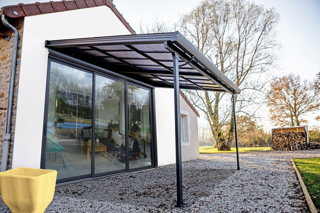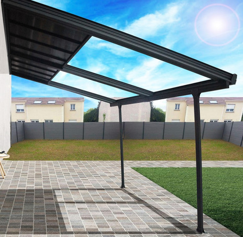 Tettoia in Alluminio Grigio Antracite con tetto in Policarbonato Amovibile - cm 300 X 400 cm La tettoia per terrazze con pannelli rimovibili offre alle persone con un'area relax ottimizzata l'opportunità di proteggersi dal sole estivo, offrendo al contempo la possibilità di far entrare luce e calore durante i mesi invernali, fermando la caduta di pioggia o neve.Per ottimizzare il vostro comfort, la tettoia a pannelli rimovibili è dotata per il suo tetto di pannelli trasparenti rimovibili in policarbonato da 6 mm.Una volta posizionato, offrirà ulteriore comfort proteggendoti da un raggio di sole cocente, pioggia o neve insistenti. I suoi pannelli rimovibili indipendentemente offrono una grande l...