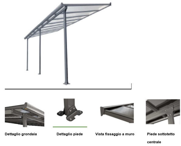 Tettoia in Alluminio Grigio Antracite con tetto in Policarbonato - cm 295 X 420 cm Dimensioni struttura:Dimensioni totali ( lar x prof ): 418 x 307 cmdimensione fronte in m : 418Dimensione lato in m: 307Superficie totale in m2: 12.83altezza parte frontale in m, : 2.10altezza a parete posteriore in m: 2.99Vuoi proteggere la tua terrazza dalle intemperie, avere uno spazio esterno per riunire la tua famiglia al riparo dal sole e dal caldo, e tutto questo senza perdere luce, la terrazza sul tetto soddisfa le tue aspettative.Molto estetica con il suo design contemporaneo che si adatta a tutti gli stili di casa, la terrazza sul tetto è una soluzione per la protezione da pioggia, grandine, sole e calore. I suoi pannelli in policarbonato trasparente da 6 mm proteggono i tuoi mobili dai raggi UV, mentre portano la luce nel tuo patio. Questa terrazza sul tetto ha una struttura in alluminio molto resistente, progettata per essere semplice e pratica da montare.La sua struttura color antracite e il policarbonato traslucido non richiedono alcuna manutenzione.- Perfetto per proteggere dalla luce solare diretta, dal calore, dalla pioggia e dalla neve- Design contemporaneo ed elegante integrato in una terrazza- Robusta struttura in alluminio- Tetto in policarbonato ultra resistente- Facile da montare- Facile manutenzioneMateriale : lastre policarbonato, colore traslucido, trattamento anti-UVMateriale struttura : alluminio, colore grigioSpessore tetto : 6 mmPali di sostegno : 3Garanzia : struttura 5 anni, copertura 2 anniImballo : collo dimensioni : 305 x 59 x 14 cm. Peso : 80,20 kg. Manuale di installazione fornito all’interno della confezioneMateriale struttura : alluminio, colore grigioMateriale copertura : lastre policarbonato, colore traslucido, trattamento anti-UVColore : grigio antraciteimballi di consegna : 4 colli peso totale111kg