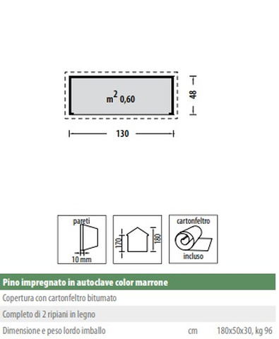 CARATTERISTICHE : Spessore della parete 10 mm Misure 130 x 48 cm h 170/180 Dimensioni collo 180x50x30 cm - Peso 96 Kg SICUREZZA: Si raccomanda di eseguire il montaggio adottando sempre i dispositivi di protezione individuali; scarpe, guanti, occhiali protettivi e utilizzare con prudenza gli elettroutensili, scale e tutti gli attrezzi da lavoro necessari. Particolare attenzione è da prestare ai bambini che vanno tenuti lontani dalla zona di lavoro, fino a montaggio completato. MANUTENZIONE: Per proteggere e prolungare la vita dell'armadio in legno è necessaria una corretta manutenzione. Tutte gli armadi in legno sono forniti grezzi, è necessario proteggerle e decorarle con l’uso di prodotti specifici, come impregnanti e antitarlo. Si raccomanda di effettuare un trattamento con impregnante cerato per esterni, scegliendo la tonalità desiderata. Il trattamento andrà ripetuto ogni qualvolta il colore perda di tonalità o brillantezza a seconda dell’esposizione del legno alle intemperie cercando di utilizzare sempre una stessa colorazione . Controllare periodicamente la stabilità dell'armadio, il serraggio delle viti e il corretto funzionamento della porta. PRECAUZIONI: Chiudere sempre la porta dopo il suo utilizzo. Non inserire mai oggetti incandescenti come barbecue ancora caldi o con braci accese.