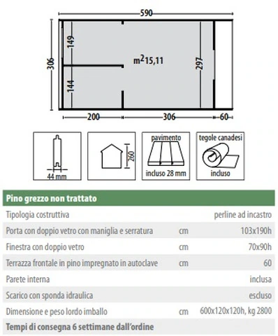 CARATTERISTICHE : Spessore della parete 44 mm      Misure pareti 300X600 cm  Misure interne 297 X 506 cm   + 60 cm terrazza             Altezza totale 260 cm                   Area 15,11m²                         Misure porte con doppio vetro 103x190 cm+ finestra 70x90 cm colli: 600x120x120 m                             peso tot. 2800kg IMPORTANTE CONSEGNA : il prodotto viene consegnato su bancale ben sigillato con legno e cellofan . Se non si è provvisti di muletto allo scarico è necessario far trovare del personale in modo da aprire il bancale sul camion con l' aiuto dell' autista e scendere i vari componenti a mano (di facile presa per 2 persone)  - sulle isole e nei centri più piccoli la consegna potrebbe richiedere qualche giorno in più. UTILE DA SAPEREBUROCRAZIA: L’installazione di una casetta comporta la richiesta alle autorità comunali. Tali richieste possono variare da comune a comune. Deve essere quindi onere e cura dell’acquirente fare le richieste, le autorizzazioni, i permessi e gli assensi delle autorità amministrative necessari secondo le norme vigenti.  INSTALLAZIONE: La casetta deve essere installata su una base stabile e indeformabile, in un luogo sopraelevato, che permetta il drenaggio dell’acqua piovana. Al riparo dagli spruzzi dell’eventuale impianto di irrigazione. A dovuta distanza di siepi verdi che impediscano la naturale traspirazione del legno. Normalmente la casetta viene consegnata con un mezzo pesante; se l’imballo è integro la casetta può rimanere all’esterno qualche giorno; (massimo una settimana) a condizione che sia poggiata su una base perfettamente in piano. Prima di iniziare il montaggio, leggere attentamente le istruzioni di montaggio;  Per garantire lunga vita alla vostra casetta è consigliabile, prima di iniziare il montaggio, applicare una mano di impregnante (trasparente o molto chiaro) su tutte le tavole e i listelli che la compongono. SICUREZZA: Si raccomanda di eseguire il montaggio adottando sempre i dispositivi di protezione individuali; scarpe, guanti, occhiali protettivi e utilizzare con prudenza gli elettroutensili, scale e tutti gli attrezzi da lavoro necessari. Particolare attenzione è da prestare ai bambini che vanno tenuti lontani dalla zona di lavoro, fino a montaggio completato. MANUTENZIONE: Per proteggere e prolungare la vita della casetta in legno è necessaria una corretta manutenzione. Tutte le casette in legno sono fornite grezze, è necessario proteggerle e decorarle con l’uso di prodotti specifici, come impregnanti e antitarlo. Si raccomanda di effettuare un trattamento con impregnante cerato per esterni, scegliendo la tonalità desiderata. Il trattamento andrà ripetuto ogni qualvolta il colore perda di tonalità o brillantezza a seconda dell’esposizione del legno alle intemperie cercando di utilizzare sempre una stessa colorazione . Controllare periodicamente la stabilità della casetta, il serraggio delle viti e il corretto funzionamento della porta e della finestra. PRECAUZIONI: Chiudere sempre la porta dopo il suo utilizzo. Non inserire mai oggetti incandescenti come barbecue ancora caldi o con braci accese. IMPERMEABILIZZAZIONE: La casetta è fornita di cartonfeltro bitumato che se montato correttamente, garantisce una durata di circa due/ tre anni, conviene quindi acquistare e impermeabilizzare la casetta con una copertura di lunga durata come tegole bituminose, onduline, guaina ardesiata ecc. ecc.