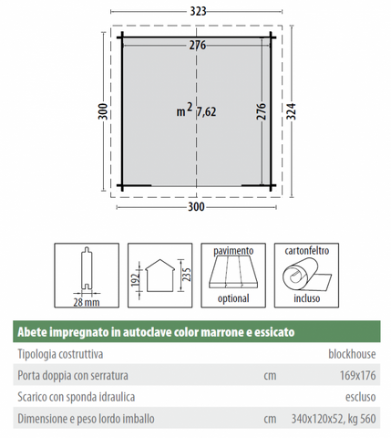 CARATTERISTICHE : Spessore della parete 28mm Misure 300x300 cm Misure interne 276x276 cm Altezza muro 192 cm Altezza totale 235 cm Area 7,62 m² Misure porte 169X176 cm Dimensioni collo 3,40x1,2x0,52 m Peso 560 Kg IMPORTANTE CONSEGNA : il prodotto viene consegnato su bancale ben sigillato con legno e cellofan . Se non si è provvisti di muletto allo scarico è necessario far trovare del personale in modo da aprire il bancale sul camion con l' aiuto dell' autista e scendere i vari componenti a mano (di facile presa per 2 persone) - sulle isole e nei centri più piccoli la consegna potrebbe richiedere qualche giorno in più. PERCHÉ SCEGLIERE QUESTO PRODOTTO:La più classica e diffusa delle casette per giardino, una soluzione che risolve il problema del rimessaggio dei giocattoli dei bambini, le biciclette, il rasaerba e tutto ciò che ingombra il garage o la cantina. UTILE DA SAPEREBUROCRAZIA: L’installazione di una casetta comporta la richiesta alle autorità comunali. Tali richieste possono variare da comune a comune. Deve essere quindi onere e cura dell’acquirente fare le richieste, le autorizzazioni, i permessi e gli assensi delle autorità amministrative necessari secondo le norme vigenti. INSTALLAZIONE: La casetta deve essere installata su una base stabile e indeformabile, in un luogo sopraelevato, che permetta il drenaggio dell’acqua piovana. Al riparo dagli spruzzi dell’eventuale impianto di irrigazione. A dovuta distanza di siepi verdi che impediscano la naturale traspirazione del legno. Normalmente la casetta viene consegnata con un mezzo pesante; se l’imballo è integro la casetta può rimanere all’esterno qualche giorno; (massimo una settimana) a condizione che sia poggiata su una base perfettamente in piano. Prima di iniziare il montaggio, leggere attentamente le istruzioni di montaggio; Per garantire lunga vita alla vostra casetta è consigliabile, prima di iniziare il montaggio, applicare una mano di impregnante (trasparente o molto chiaro) su tutte le tavole e i listelli che la compongono. SICUREZZA: Si raccomanda di eseguire il montaggio adottando sempre i dispositivi di protezione individuali; scarpe, guanti, occhiali protettivi e utilizzare con prudenza gli elettroutensili, scale e tutti gli attrezzi da lavoro necessari. Particolare attenzione è da prestare ai bambini che vanno tenuti lontani dalla zona di lavoro, fino a montaggio completato. PRECAUZIONI: Chiudere sempre la porta dopo il suo utilizzo. Non inserire mai oggetti incandescenti come barbecue ancora caldi o con braci accese. IMPERMEABILIZZAZIONE: La casetta è fornita di cartonfeltro bitumato che se montato correttamente, garantisce una durata di circa due/ tre anni, conviene quindi acquistare e impermeabilizzare la casetta con una copertura di lunga durata come tegole bituminose, onduline, guaina ardesiata ecc. ecc.