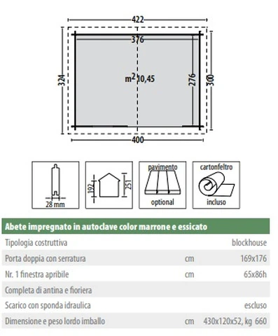 CARATTERISTICHE :  Spessore della parete 28mm           Misure 324x422 cm   Misure interne 276x376 cm              Altezza muro  192 cm      Altezza totale  251cm                      Area  10,45 m²      Misure porte  169x176 cm + finesta 65x86 cm        Dimensioni collo 430x120x52 cm        Peso   660 Kg IMPORTANTE CONSEGNA : il prodotto viene consegnato su bancale ben sigillato con legno e cellofan . Se non si è provvisti di muletto allo scarico è necessario far trovare del personale in modo da aprire il bancale sul camion con l' aiuto dell' autista e scendere i vari componenti a mano (di facile presa per 2 persone)  - sulle isole e nei centri più piccoli la consegna potrebbe richiedere qualche giorno in più. PERCHÉ SCEGLIERE QUESTO PRODOTTO:La più classica e diffusa delle casette per giardino, una soluzione che risolve il problema del rimessaggio dei giocattoli dei bambini, le biciclette, il rasaerba e tutto ciò che ingombra il garage o la cantina. UTILE DA SAPEREBUROCRAZIA: L’installazione di una casetta comporta la richiesta alle autorità comunali. Tali richieste possono variare da comune a comune. Deve essere quindi onere e cura dell’acquirente fare le richieste, le autorizzazioni, i permessi e gli assensi delle autorità amministrative necessari secondo le norme vigenti.  INSTALLAZIONE: La casetta deve essere installata su una base stabile e indeformabile, in un luogo sopraelevato, che permetta il drenaggio dell’acqua piovana. Al riparo dagli spruzzi dell’eventuale impianto di irrigazione. A dovuta distanza di siepi verdi che impediscano la naturale traspirazione del legno. Normalmente la casetta viene consegnata con un mezzo pesante; se l’imballo è integro la casetta può rimanere all’esterno qualche giorno; (massimo una settimana) a condizione che sia poggiata su una base perfettamente in piano. Prima di iniziare il montaggio, leggere attentamente le istruzioni di montaggio;  Per garantire lunga vita alla vostra casetta è consigliabile, prima di iniziare il montaggio, applicare una mano di impregnante (trasparente o molto chiaro) su tutte le tavole e i listelli che la compongono. SICUREZZA: Si raccomanda di eseguire il montaggio adottando sempre i dispositivi di protezione individuali; scarpe, guanti, occhiali protettivi e utilizzare con prudenza gli elettroutensili, scale e tutti gli attrezzi da lavoro necessari. Particolare attenzione è da prestare ai bambini che vanno tenuti lontani dalla zona di lavoro, fino a montaggio completato. PRECAUZIONI: Chiudere sempre la porta dopo il suo utilizzo. Non inserire mai oggetti incandescenti come barbecue ancora caldi o con braci accese. IMPERMEABILIZZAZIONE: Compreso  cartonfeltro bitumato che se montato correttamente, garantisce una durata di circa due/ tre anni, conviene quindi acquistare e impermeabilizzare la casetta con una copertura di lunga durata come tegole bituminose, onduline, guaina ardesiata ecc. ecc.