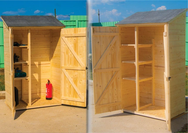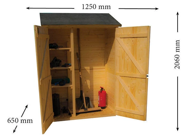 CARATTERISTICHE : Spessore della parete 16mm Misure 120x60cm Altezza muro 173cm Altezza totale 206cm Area 0,70 m² pavimento in osb 12 mm da fissare su travicelli in legno massello sez 25x40mm Misure porte 2 X 55X 169 cm Colli: 180 x 60 x 40 cm Peso tot. 120kgMateriale : picea ( fam Pinaceae ) massello non trattato. Umidità : 14 – 18 %. Colore : legno naturaleTrattamento Non trattatoPavimento : pavimento in osb 12 mm da fissare su travicelli in legno massello sez 25x40mmManutenzione Trattare con impregnante, sia all’interno che all’esterno, subito dopo il montaggioPareti : pannelli in abete pre-assemblati con assi piallate in abete, con scanalature e linguette, spessore 16mm, fissati su telaio sezione 25x25mm. Viti da legno fornite nel sacchetto di ferramenta in dotazione. Consegnato con 3 ripiani per la sistemazionePorta : Porta cieca a 2 ante, dimensione 55 x 169 cm cad, fornita di chiavistello per catenaccio cerniere bi-cromateStruttura tetto : 2 pignoni in pannelli pre-montati di tavole piallate con scanalature e linguette in abete spess 16mm fissate su telaio sez 25x25mm e putrelle in legno masselloCopertura : OSB + carta catramata Imballo : Pallet dimensioni : 180 x 60 x 40 cm, peso 120 kg Origine : Prodotto fabbricato in EuropaManuale di installazione fornito all’interno della confezioneConsigli d’uso : Uso domestico, per ricoverare qualsiasi prodotto non pericolosoSuggerimenti per la posa in opera : consigliamo installazione su soletta in cemento. Operazione da effettuare prima della posa in opera ed in tempo utile per un perfetto consolidamento prima del montaggio .