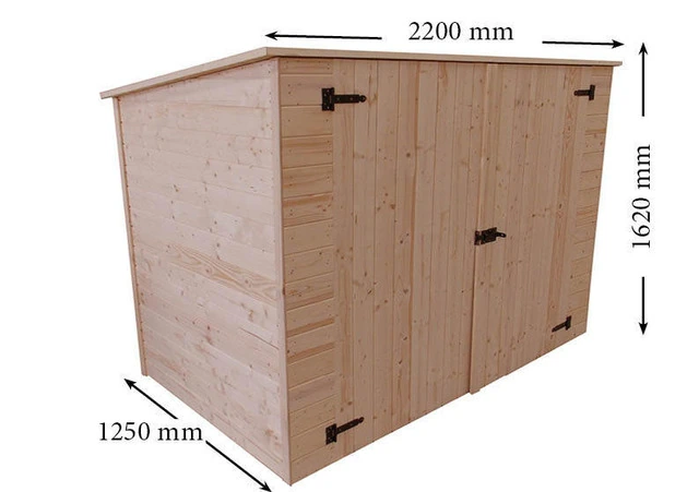 CARATTERISTICHE :  Spessore della parete 16mm                   Misure 200x120cm      Altezza muro 143cm                                Altezza totale 162cm       Area 2,37 m²                                            pavimento osb 12 mm da fissare su travicelli in legno massello sez 25x40mm    Misure porte 2 x 79 x 159 cm                    Colli: : 180 x 120 x 35 cm     Peso tot.  150kgMateriale :  picea ( fam Pinaceae ) massello non trattato. Umidità : 14 – 18 %. Colore : legno naturaleTrattamento  Non trattatoPavimento :   pavimento osb  spess 12 mm da fissare su travicelli in legno massello sez 25x40mmManutenzione Trattare con impregnante, sia all’interno che all’esterno, subito dopo il montaggioPareti :  pannelli in abete pre-assemblati con assi piallate in abete, con scanalature e linguette, spessore 16mm, fissati su telaio sezione 25x25mm. Viti da legno fornite nel sacchetto di ferramenta in dotazione.Porta :   Porta cieca dimensione 2 x 79 x 159 cm, fornita di chiavistello per catenaccio, cerniere bi-cromateStruttura tetto : 2 pignoni in pannelli pre-montati di tavole piallate con scanalature e linguette in abete spess 16mm fissate su telaio sez 25x25mm e putrelle in legno masselloCopertura :    OSB + copertura in carta catramata, colore scuro.Imballo : Pallet  dimensioni : 180 x 120 x 35 cm, peso  150 kg  Origine :  Prodotto fabbricato in EuropaManuale di installazione fornito  all’interno della confezioneConsigli d’uso : Uso  domestico, per ricoverare qualsiasi prodotto non pericolosoSuggerimenti per la posa in opera :da  installare su  basamento. Operazione da effettuare prima della posa in opera  ed in tempo utile per un perfetto consolidamento prima del montaggio .