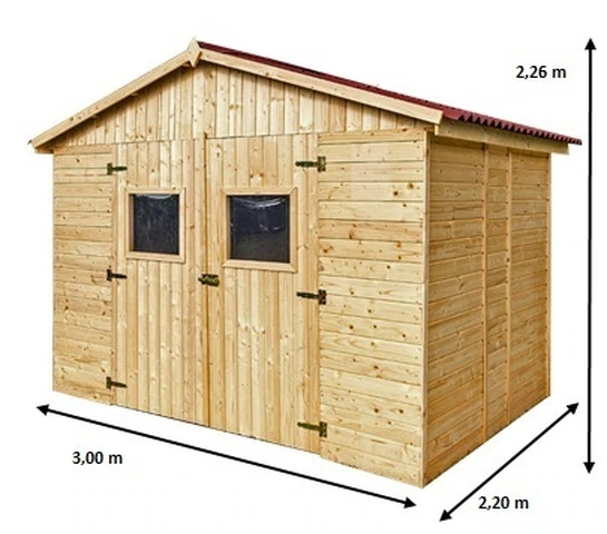 CARATTERISTICHE :  Spessore della parete 16mm                        Misure 280x200cm      Altezza muro 172cm                                     Altezza totale 226 cm       Area 5,41 m²                                                   Pavimento obs 12 mm / senza pavimento                 Misure porte 160X170 cm                              Colli: 1,75x0,80x0,70 m  (senza pavimento)   Colli: 1,75x0,80x0,70 m + 2,00x0,24x0,28 (con pavimento)     Peso tot.  250kg(senza pavimento)/275kg (con pavimento)Materiale :  picea ( fam Pinaceae ) massello non trattato. Umidità : 14 – 18 %. Colore : legno naturaleCertificazione : FSC (solo per casetta senza pavimento)Trattamento  Non trattatoPavimento :   pavimento  in OSB trattato, spessore 12 mm (con pavimento)Pavimento: Assente (Per casetta senza pavimento)Manutenzione Trattare con impregnante, sia all’interno che all’esterno, subito dopo il montaggioPareti :  Pannelli preassemblati di tavole piallate con scanalatura e linguetta in abete spessore 16 mm fissati su sezione telaio 25x25 mmPorta :   Porta doppia con vetro Pvc trasparente, cm 160 x 170, fornita di chiavistello per catenaccio e colorata con finitura epossidica nera.Copertura :      lastre ondulate bitumate colorate, larghezza 1m.Imballo : Pallet reggiato dimensioni : 175 x 80 x 75 cm. + collo 200 x 24 x 28  Peso : 275 kg.(con pavimento)Imballo : Pallet reggiato dimensioni : 175 x 80 x 70 cm.  Peso : 250 kg.(senza pavimento)Origine :  Prodotto fabbricato in EuropaManuale di installazione fornito  all’interno della confezioneConsigli d’uso : Uso  domestico, per ricoverare qualsiasi prodotto non pericolosoSuggerimenti per la posa in opera : installare necessariamente su  soletta in cemento. Operazione da effettuare