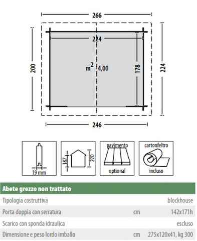 CODICE ARTICOLO: ITALFROM_10862 CARATTERISTICHE : Spessore della parete 19 mm Misure pareti 246x200 cm Misure interne 224x178 cm Altezza muro 187 cm Altezza totale 220cm Area 4.00m² Misure porte 142x171 cm colli: 275x120x41 m peso tot. 300kg IMPORTANTE CONSEGNA : il prodotto viene consegnato su bancale ben sigillato con legno e cellofan . Se non si è provvisti di muletto allo scarico è necessario far trovare del personale in modo da aprire il bancale sul camion con l' aiuto dell' autista e scendere i vari componenti ...