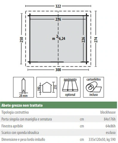 CARATTERISTICHE : Spessore della parete 28 mm      Misure pareti 300x250 cm  Misure interne 226x276 cm             Altezza muro 190 cm   Altezza totale 235cm                   Area 6.24m²                         Misure porte 84x176 cm + finestra 64x86 colli: 335x120x50 m                             peso tot. 590kg IMPORTANTE CONSEGNA : il prodotto viene consegnato su bancale ben sigillato con legno e cellofan . Se non si è provvisti di muletto allo scarico è necessario far trovare del personale in modo da aprire il bancale sul camion con l' aiuto dell' autista e scendere i vari componenti a mano (di facile presa per 2 persone)  - sulle isole e nei centri più piccoli la consegna potrebbe richiedere qualche giorno in più. UTILE DA SAPEREBUROCRAZIA: L’installazione di una casetta comporta la richiesta alle autorità comunali. Tali richieste possono variare da comune a comune. Deve essere quindi onere e cura dell’acquirente fare le richieste, le autorizzazioni, i permessi e gli assensi delle autorità amministrative necessari secondo le norme vigenti.  INSTALLAZIONE: La casetta deve essere installata su una base stabile e indeformabile, in un luogo sopraelevato, che permetta il drenaggio dell’acqua piovana. Al riparo dagli spruzzi dell’eventuale impianto di irrigazione. A dovuta distanza di siepi verdi che impediscano la naturale traspirazione del legno. Normalmente la casetta viene consegnata con un mezzo pesante; se l’imballo è integro la casetta può rimanere all’esterno qualche giorno; (massimo una settimana) a condizione che sia poggiata su una base perfettamente in piano. Prima di iniziare il montaggio, leggere attentamente le istruzioni di montaggio;  Per garantire lunga vita alla vostra casetta è consigliabile, prima di iniziare il montaggio, applicare una mano di impregnante (trasparente o molto chiaro) su tutte le tavole e i listelli che la compongono. SICUREZZA: Si raccomanda di eseguire il montaggio adottando sempre i dispositivi di protezione individuali; scarpe, guanti, occhiali protettivi e utilizzare con prudenza gli elettroutensili, scale e tutti gli attrezzi da lavoro necessari. Particolare attenzione è da prestare ai bambini che vanno tenuti lontani dalla zona di lavoro, fino a montaggio completato. MANUTENZIONE: Per proteggere e prolungare la vita della casetta in legno è necessaria una corretta manutenzione. Tutte le casette in legno sono fornite grezze, è necessario proteggerle e decorarle con l’uso di prodotti specifici, come impregnanti e antitarlo. Si raccomanda di effettuare un trattamento con impregnante cerato per esterni, scegliendo la tonalità desiderata. Il trattamento andrà ripetuto ogni qualvolta il colore perda di tonalità o brillantezza a seconda dell’esposizione del legno alle intemperie cercando di utilizzare sempre una stessa colorazione . Controllare periodicamente la stabilità della casetta, il serraggio delle viti e il corretto funzionamento della porta e della finestra. PRECAUZIONI: Chiudere sempre la porta dopo il suo utilizzo. Non inserire mai oggetti incandescenti come barbecue ancora caldi o con braci accese. IMPERMEABILIZZAZIONE: La casetta è fornita di cartonfeltro bitumato che se montato correttamente, garantisce una durata di circa due/ tre anni, conviene quindi acquistare e impermeabilizzare la casetta con una copertura di lunga durata come tegole bituminose, onduline, guaina ardesiata ecc. ecc. MONTAGGIO: