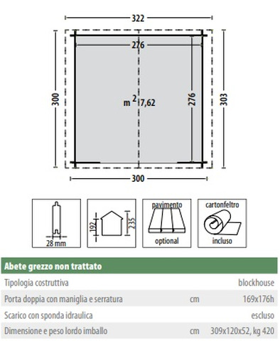 CARATTERISTICHE : Spessore della parete 28 mm Misure pareti 300x300 cm Misure interne 276x276 cm Altezza muro 192 cm Altezza totale 235cm Area 7.62 m² Misure porte 169x176 cm colli: 309x120x52 m peso tot. 420 kg IMPORTANTE CONSEGNA : il prodotto viene consegnato su bancale ben sigillato con legno e cellofan . Se non si è provvisti di muletto allo scarico è necessario far trovare del personale in modo da aprire il bancale sul camion con l' aiuto dell' autista e scendere i vari componenti a mano (di facile presa per 2 persone) - sulle isole e nei centri più piccoli la consegna potrebbe richiedere qualche giorno in più. UTILE DA SAPEREBUROCRAZIA: L’installazione di una casetta comporta la richiesta alle autorità comunali. Tali richieste possono variare da comune a comune. Deve essere quindi onere e cura dell’acquirente fare le richieste, le autorizzazioni, i permessi e gli assensi delle autorità amministrative necessari secondo le norme vigenti. INSTALLAZIONE: La casetta deve essere installata su una base stabile e indeformabile, in un luogo sopraelevato, che permetta il drenaggio dell’acqua piovana. Al riparo dagli spruzzi dell’eventuale impianto di irrigazione. A dovuta distanza di siepi verdi che impediscano la naturale traspirazione del legno. Normalmente la casetta viene consegnata con un mezzo pesante; se l’imballo è integro la casetta può rimanere all’esterno qualche giorno; (massimo una settimana) a condizione che sia poggiata su una base perfettamente in piano. Prima di iniziare il montaggio, leggere attentamente le istruzioni di montaggio; Per garantire lunga vita alla vostra casetta è consigliabile, prima di iniziare il montaggio, applicare una mano di impregnante (trasparente o molto chiaro) su tutte le tavole e i listelli che la compongono. SICUREZZA: Si raccomanda di eseguire il montaggio adottando sempre i dispositivi di protezione individuali; scarpe, guanti, occhiali protettivi e utilizzare con prudenza gli elettroutensili, scale e tutti gli attrezzi da lavoro necessari. Particolare attenzione è da prestare ai bambini che vanno tenuti lontani dalla zona di lavoro, fino a montaggio completato. MANUTENZIONE: Per proteggere e prolungare la vita della casetta in legno è necessaria una corretta manutenzione. Tutte le casette in legno sono fornite grezze, è necessario proteggerle e decorarle con l’uso di prodotti specifici, come impregnanti e antitarlo. Si raccomanda di effettuare un trattamento con impregnante cerato per esterni, scegliendo la tonalità desiderata. Il trattamento andrà ripetuto ogni qualvolta il colore perda di tonalità o brillantezza a seconda dell’esposizione del legno alle intemperie cercando di utilizzare sempre una stessa colorazione . Controllare periodicamente la stabilità della casetta, il serraggio delle viti e il corretto funzionamento della porta e della finestra. PRECAUZIONI: Chiudere sempre la porta dopo il suo utilizzo. Non inserire mai oggetti incandescenti come barbecue ancora caldi o con braci accese. IMPERMEABILIZZAZIONE: La casetta è fornita di cartonfeltro bitumato che se montato correttamente, garantisce una durata di circa due/ tre anni, conviene quindi acquistare e impermeabilizzare la casetta con una copertura di lunga durata come tegole bituminose, onduline, guaina ardesiata ecc. ecc. MONTAGGIO: