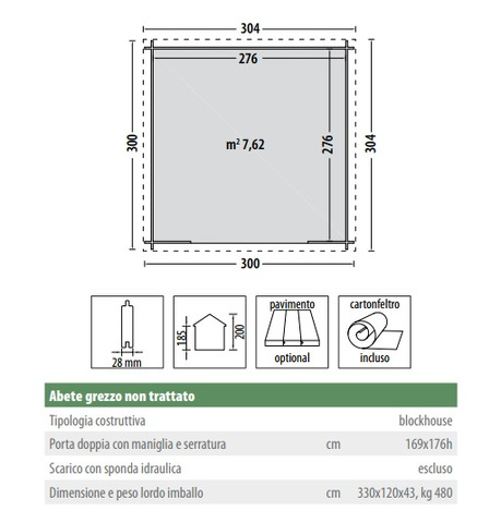 CARATTERISTICHE : Spessore della parete 28 mm          Misure pareti 304x300 cm  Misure interne 276x276 cm             Altezza muro 185 cm   Altezza totale 200cm                        Area 7.62m²                         Misure porte 169x173h cm colli: 330x120x43 cm            &...