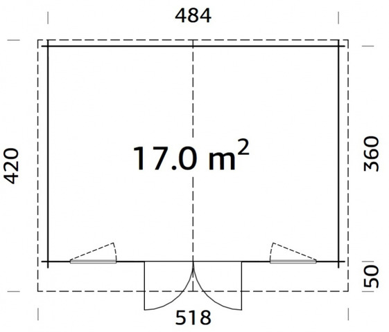 CARATTERISTICHE :  Spessore della parete 28mm        Misure pareti  484x360 cm  Misure travi  504x380 cm              Altezza muro   182 cm  Altezza totale  245 cm                   Sporgenza tetto  50 cm  Area  17,0 m ²                             Volume  36,3 m ³  Area tetto / gradiente  22,4 m² / 14,6° ...